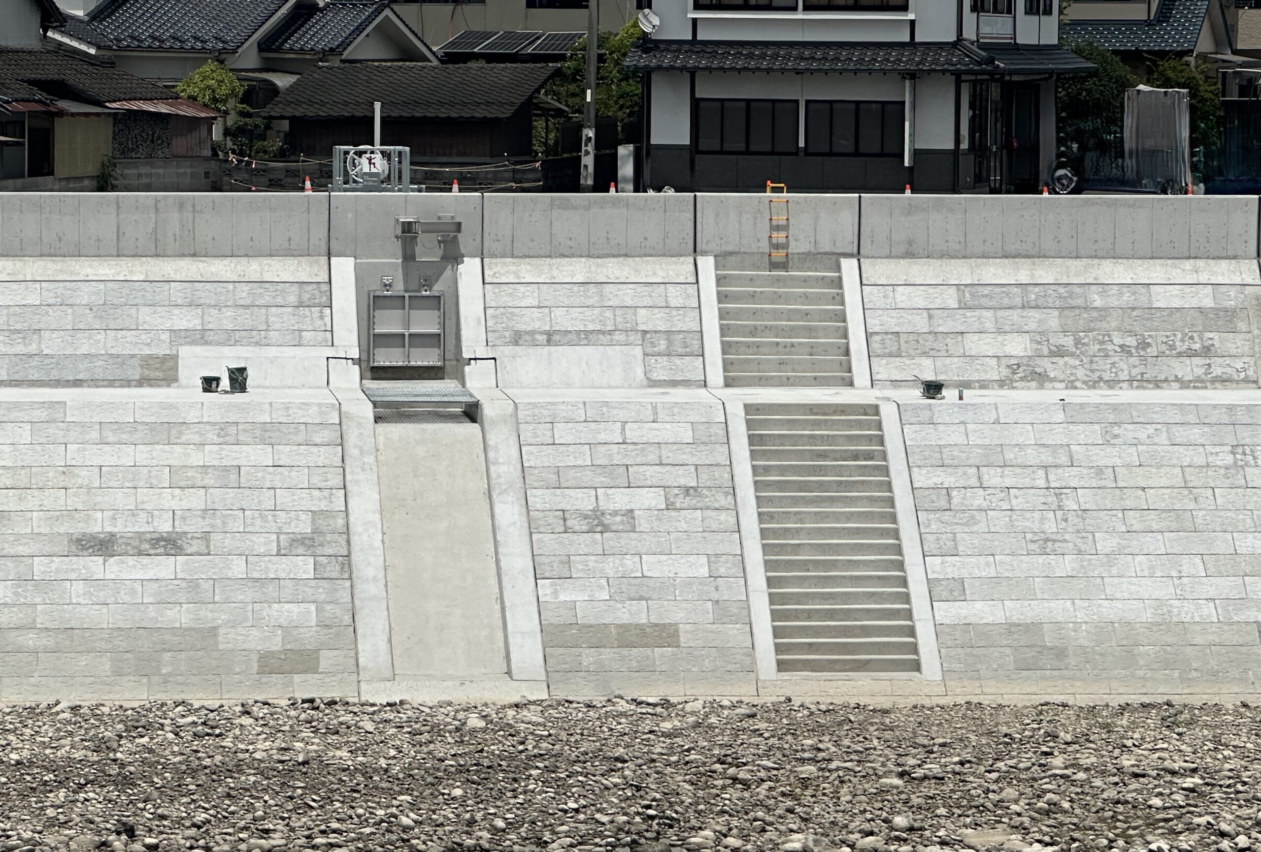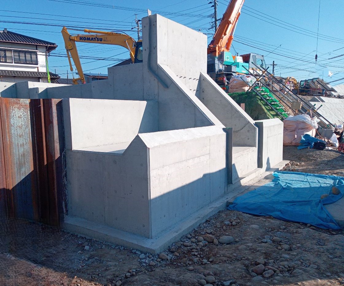河川工事拡幅に伴い、樋管工・水路工・階段工・パラペット工の